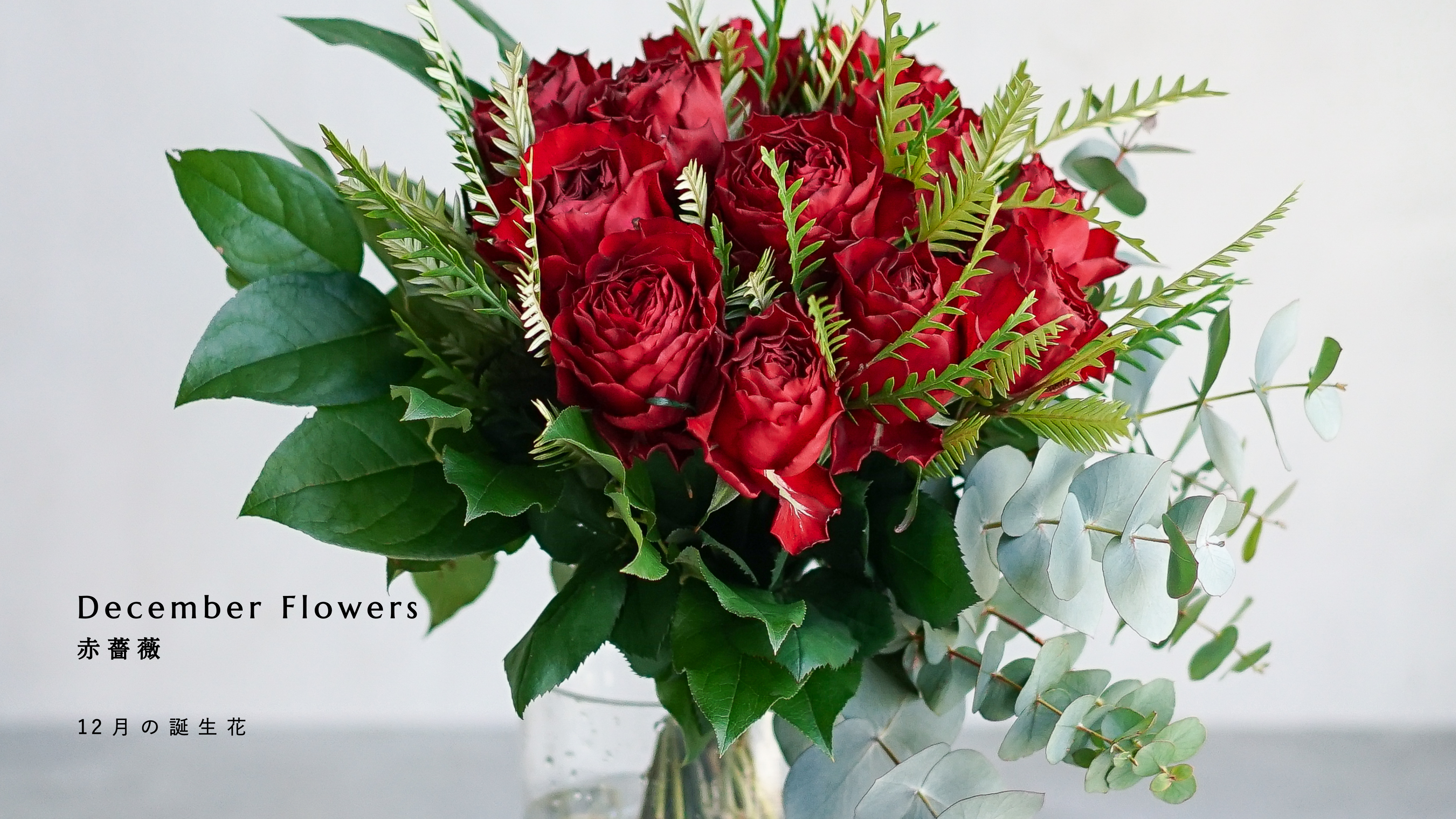 赤い薔薇、ユーカリ、レモンリーフ、ヒムロスギ、モミの葉、クリスマスの暖かな祝福を感じさせる、豪華で心温まる赤い薔薇メインの花束です。