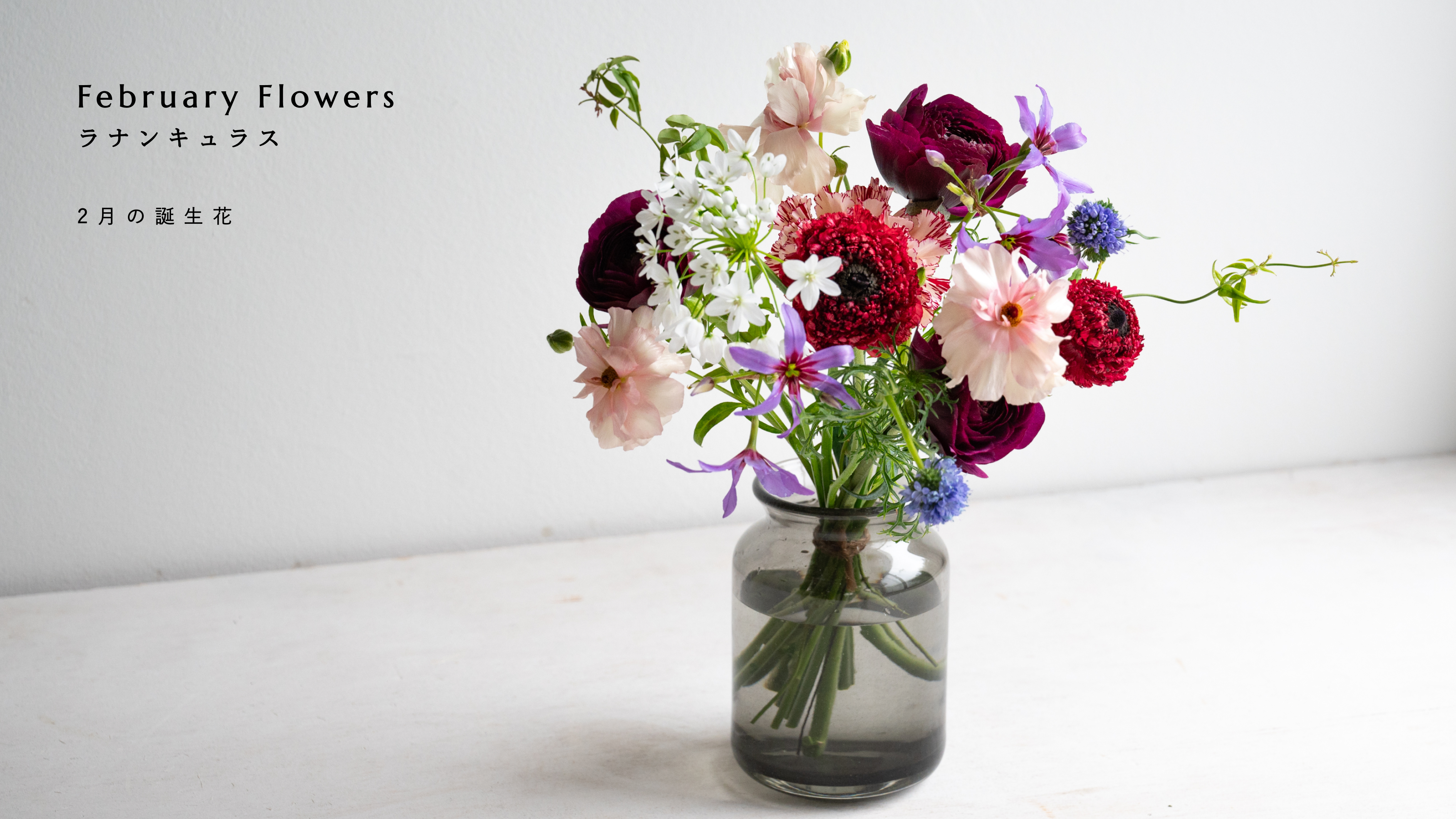 ラナンキュラス、アネモネ、スカビオサ、クレマチス、コスモス、ホワイトレースフラワー、グリーン、深みのある色合いとナチュラルな動きが魅力の花束です。