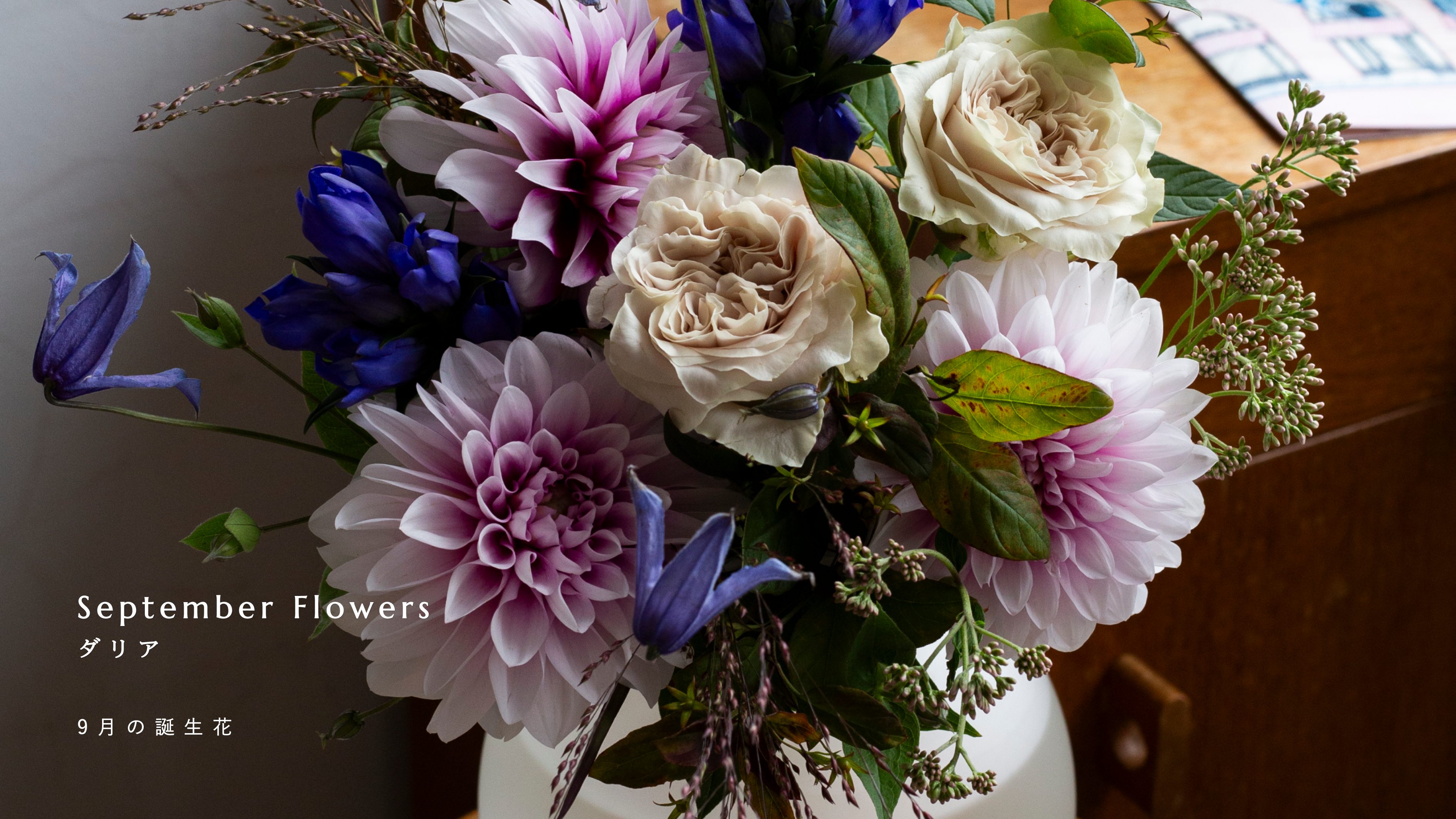 深みのあるダリアの花びらが印象的で、秋の訪れを感じさせる上品な花束。落ち着いた雰囲気と華やかさが絶妙に調和したデザイン。
