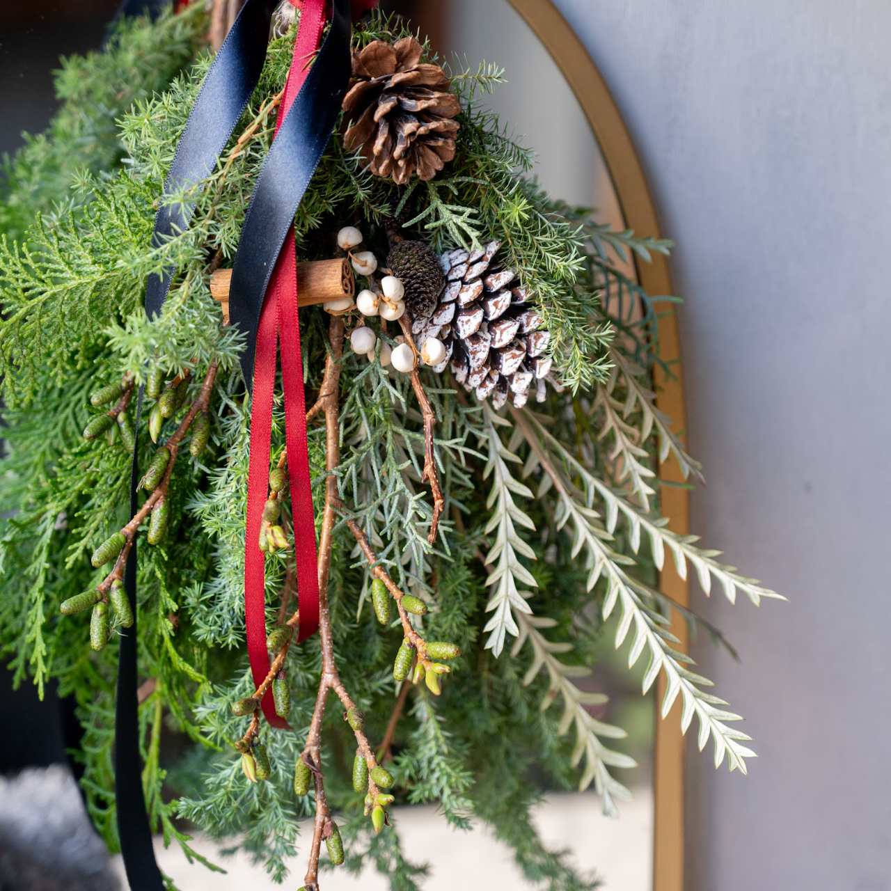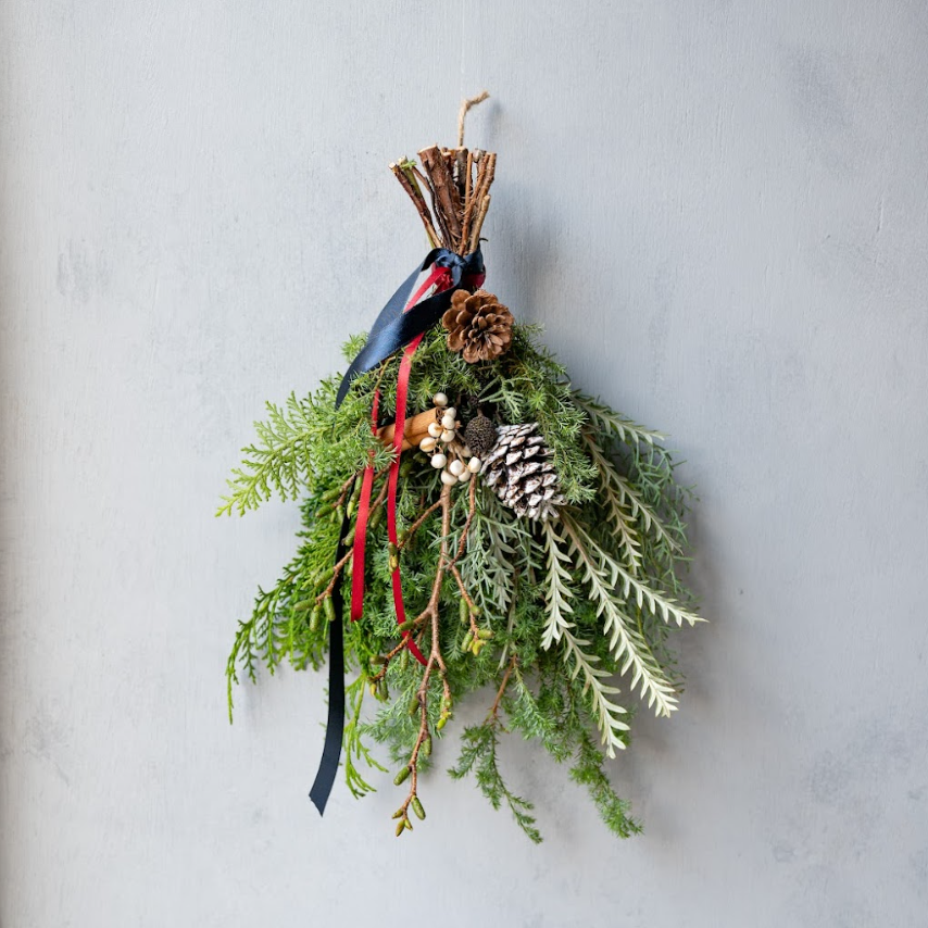 スワッグに用いるのはフレッシュなコニファー。深い緑の色合いの「ヒムロスギ」や、雪景色を思わせるような銀白色が美しい「ブルーアイス」など、色や質感が絶妙に異なるコニファーを数品種セレクトしました。そこに、軽やかな動きを添えるヤシャブヤシと、個性ある葉姿が印象的なグレビレアアイバンホーを組み合わせ、存在感のあるデザインに仕上げました。木の実のやさしい白、リボンの深い赤とネイビーがアクセントになり、スタイリッシュでありながらしっかりと季節感を感じられる、本格的なホリデーアイテムです。