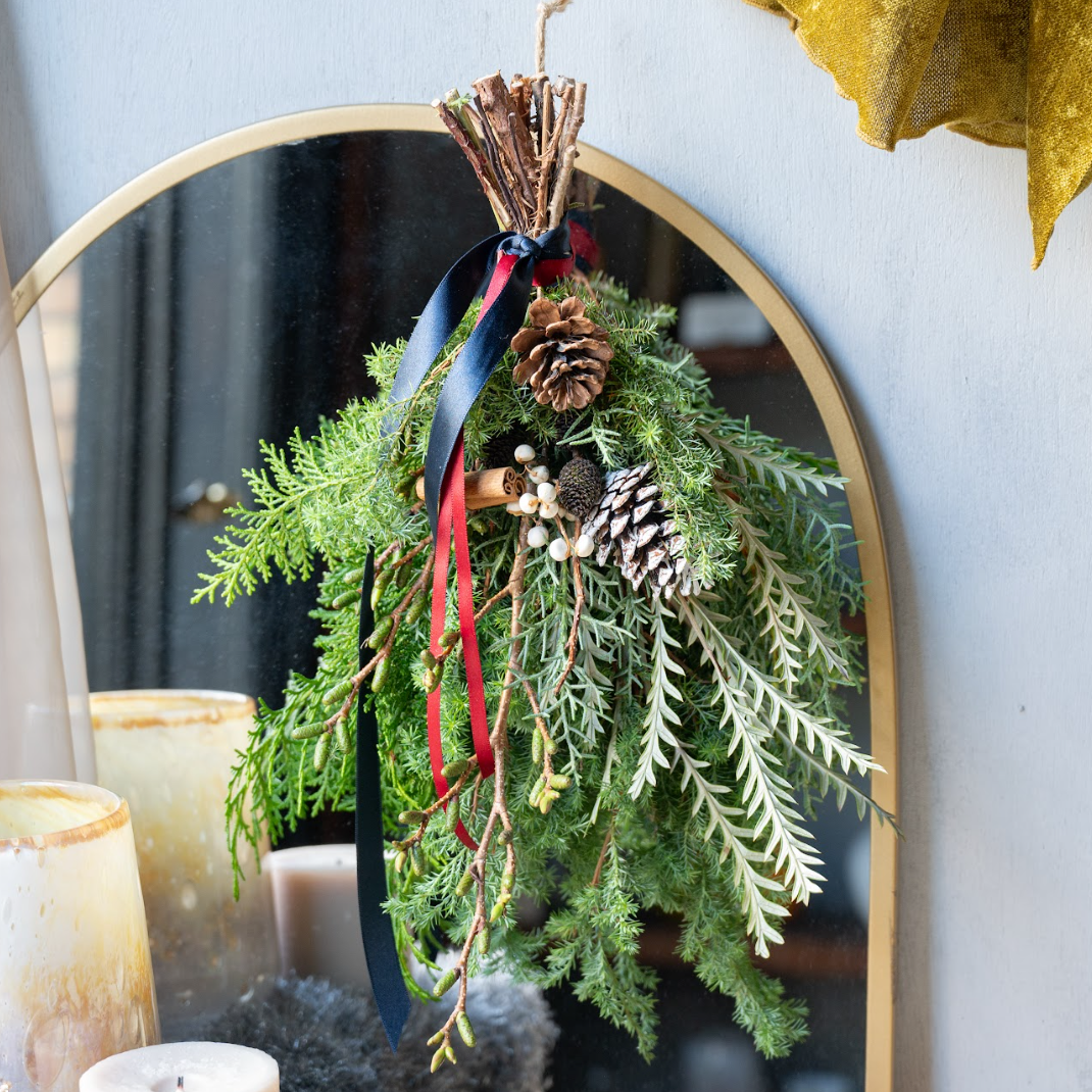 ヨーロッパでは、スワッグは「魔除け」や「繁栄」の願いを込めた冬の飾りとして、玄関に飾られてきた歴史があります。ドアに吊るせば、お迎えのしつらえとして、リビングやベッドルームでは、空間をさりげなく彩るクリスマスインテリアとしてお楽しみいただけます。